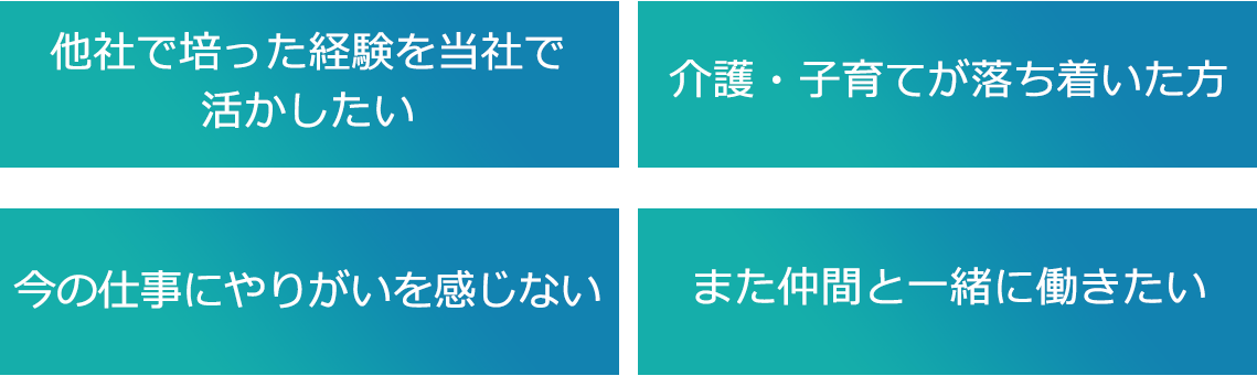 「一度辞めたから気まずい」「歓迎してもらえるか」などの不安もあるかと思いますが、 当社では約1割の方が再入社されご活躍されておりますので、ご安心下さい。